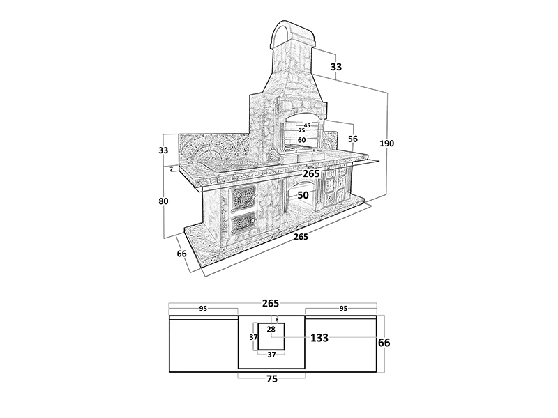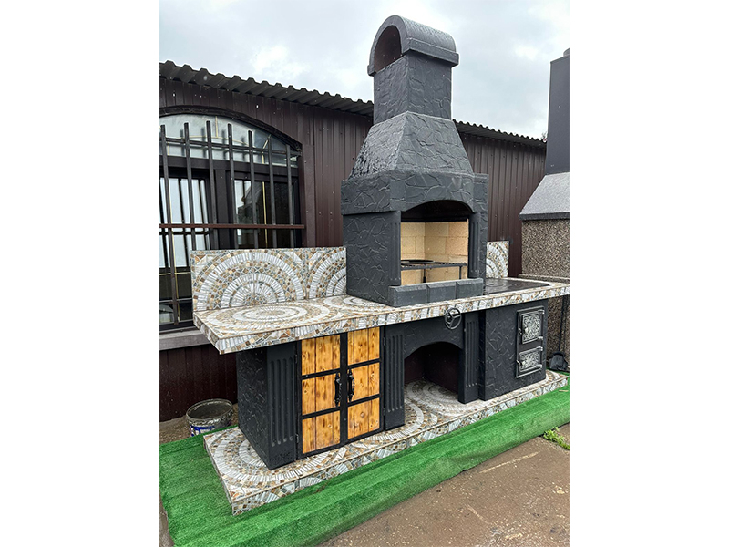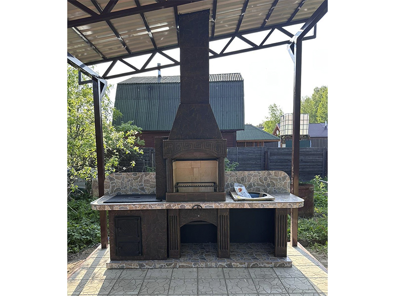 Внутри печь сделана из армированного бетона — это тоже очень надежное решение, которое неоднократно себя зарекомендовало. Мы работаем на рынке более 10 лет, поэтому хорошо понимаем, какой должна быть основа печи-барбекю, чтобы она хорошо справлялась с возложенными на нее задачами, не теряла функциональность и внешний вид долгое время.