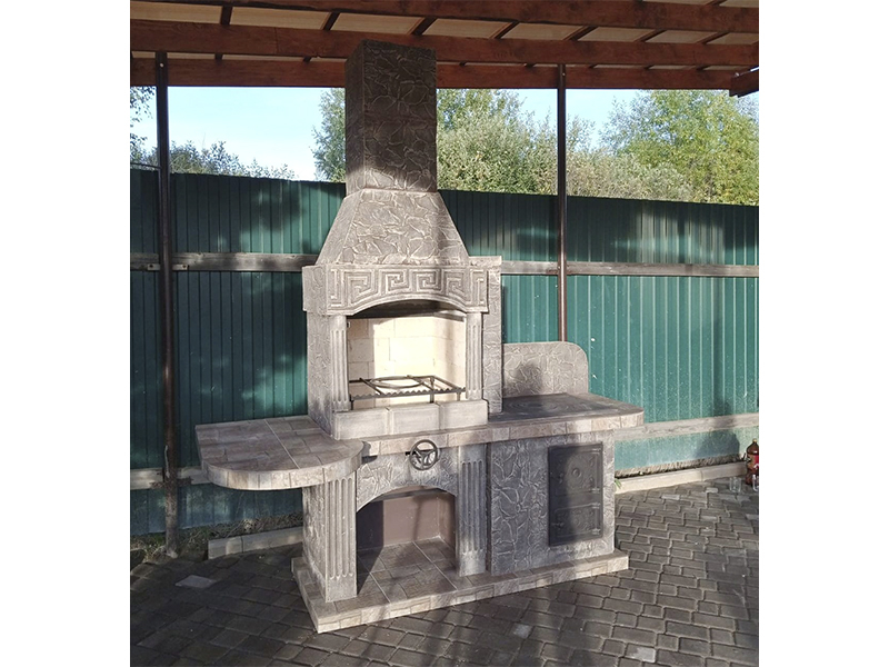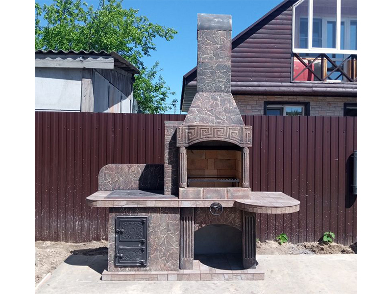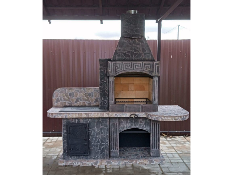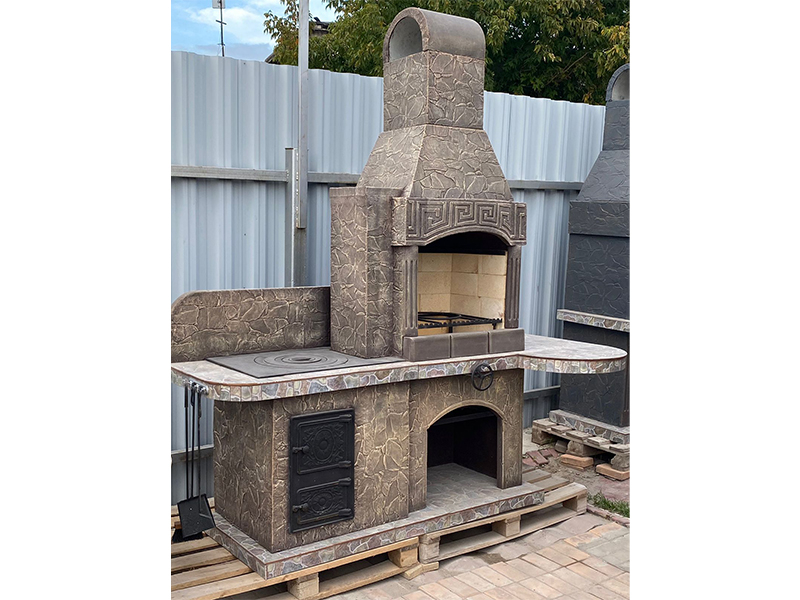 Печь-барбекю для улицы либо беседки замечательно подойдет для тех, кто любит собираться за одним столом семьей или с друзьями. Две столешницы и просторная топка рассчитаны на быстрое приготовление разных блюд.