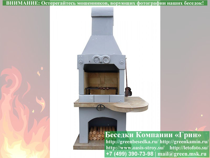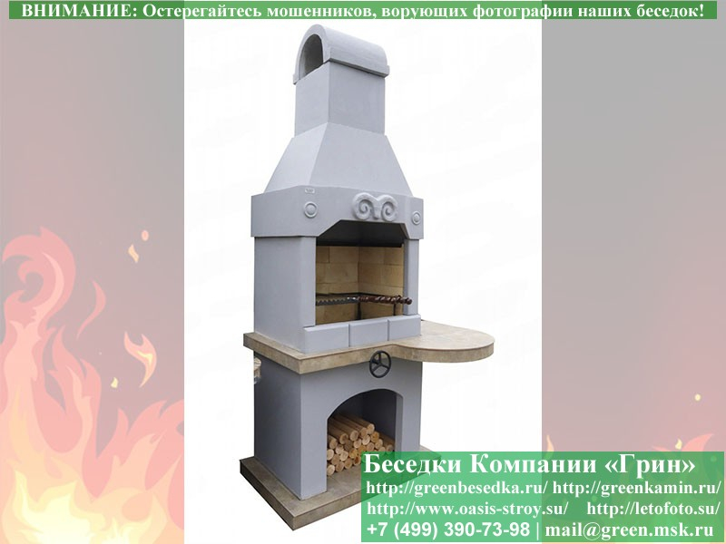Здесь вы можете купить барбекю с грилем из проверенных годами материалов. Для этой модели выбраны огнеупорный кирпич, армированный бетон и фасадная краска для окрашивания.