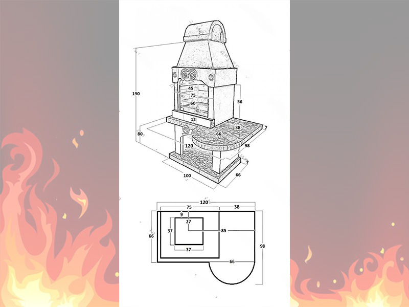 Выполнена из огнеупорного кирпича и армированного бетона. Снизу предусмотрено место для дров.