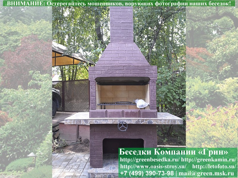Модель №7 украшена керамической плиткой, которая выполняет в том числе и практическую функцию. Такую плитку легче мыть, а еще в ней нет пор, в которые будут забиваться остатки продуктов, что делает поверхность гигиеничной при правильном уходе. Плиткой отделана как столешница комплекса барбекю, так и место для хранения дров.