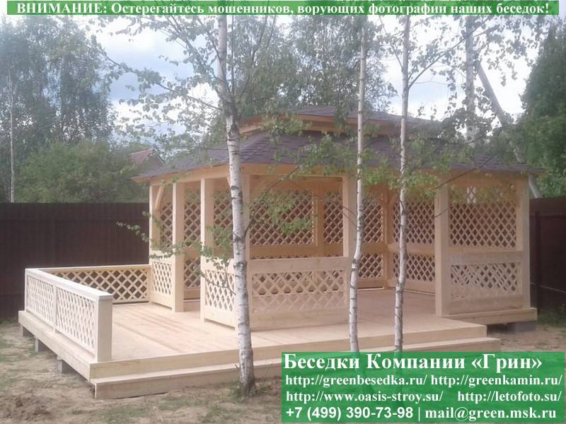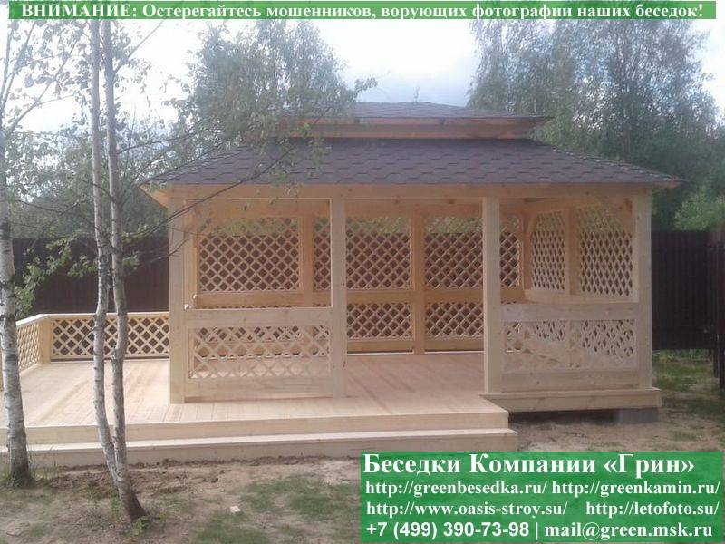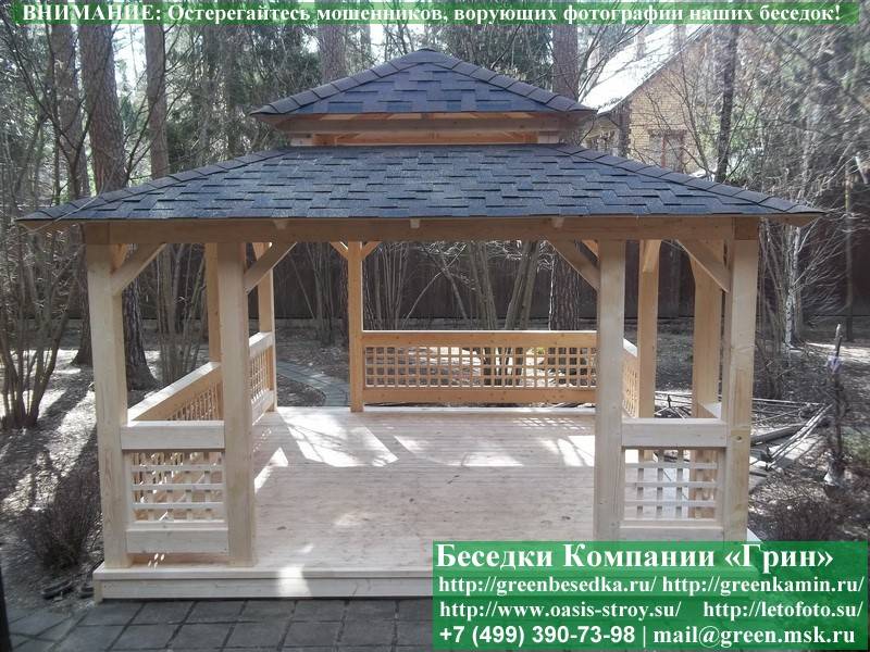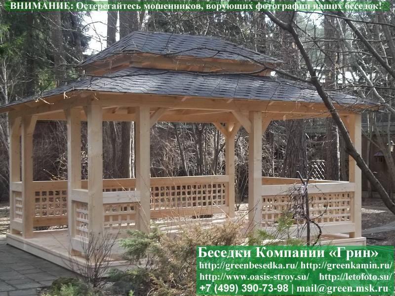Большая японская беседка 4х5 метров изготавливается из сосны, с двухъярусной крышей с воздушным клапаном. Воздушный клапан не выполняет ни каких функций и имеет декоративное назначение. В качестве несущих стоек используется строганый брус 150х150 (140х140) мм, естественной влажности. Возможно изготовление беседок из сухого материала. Цена за такой вариант несколько выше. Рассчитывается индивидуально. Берется предоплата 30%. Размер бруса стоек можно заменить на 90х90 мм. для уменьшения стоимости беседки. Стандартно изготавливается беседка открытая с 4-х сторон выше подоконника, но каждую сторону можно закрыть перголой (решеткой). На крышу беседки укладывается мягкая битумная черепица: Коричневых, Зеленых и Бордовых цветов. Открытые и закрытые варианты беседок. Срок изготовления и монтажа беседки на участке 7-10 дней. Беседки поставляются в не крашеном виде.