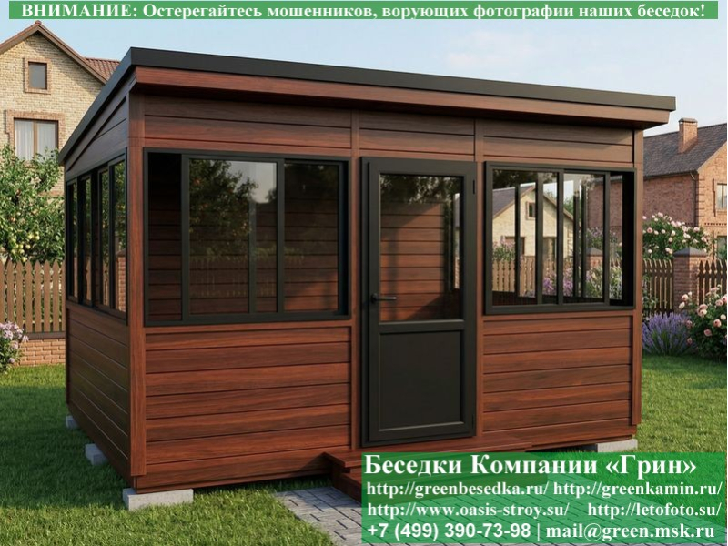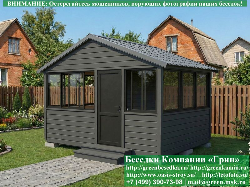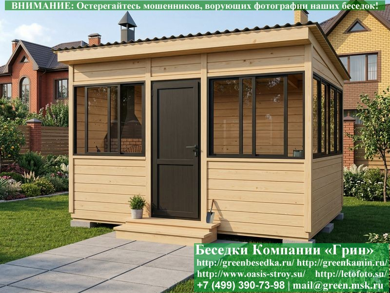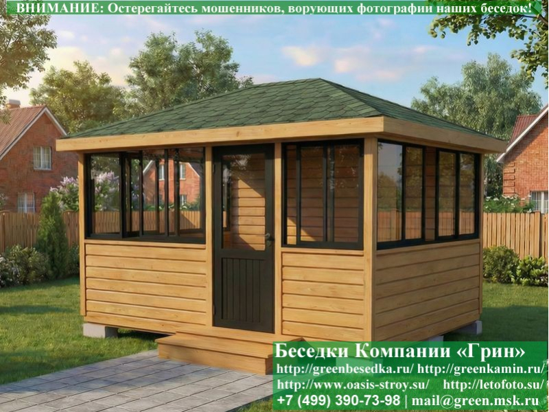 Застекленная беседка 3х4 метра изготавливается из сосны, по специальной каркасной технологии. При строительстве беседок используется сухое дерево камерной сушки. В качестве каркаса беседки используется  очень надежная Имитация бруса 17х140 мм. В отличие от вагонки, она не гнется, не набухает и не идет трещинами. Имитацию бруса можно заменить на блокхаус (имитация бревна). Используется усиленная конструкция крепления стенок. В качестве несущих стоек используется строганый брус. По углам дополнительно устанавливается брус 90х90 мм. На пол кладется толстая сухая строганая доска 35 мм (не шпунт). Пол обрабатывается антисептиком. Половую доску можно заменить на шпунтованную 36 мм или террасную доску ДПК. В беседку устанавливаются однорамные раздвижные алюминиевые окна фирмы "Русокон". Количество застекленных сторон и количество открывающихся окон обговаривается дополнительно. Устанавливается железная или алюминиевая дверь. Беседки изготавливаются с односкатной, двухскатной, четырехскатной крышей. На крышу кладется металлочерепица, мягкая черепица или профлист: Коричневых, Зеленых, Бордовых, Серых цветов. Срок изготовления и установки беседки на участке составляет 10-14 дней (срок изготовление алюминиевых окон). Беседки поставляются в не крашеном виде. Возможна покраска беседок в цеху или полная обработка антисептиком. Дополнительно предлагаем установку в деревянные беседки с алюминиевыми окнами недорогих безопасных быстровозводимых печей-барбекю, установка в течение дня, или более дорогих и сложных комплексов-барбекю и мангалов-барбекю из кирпича.