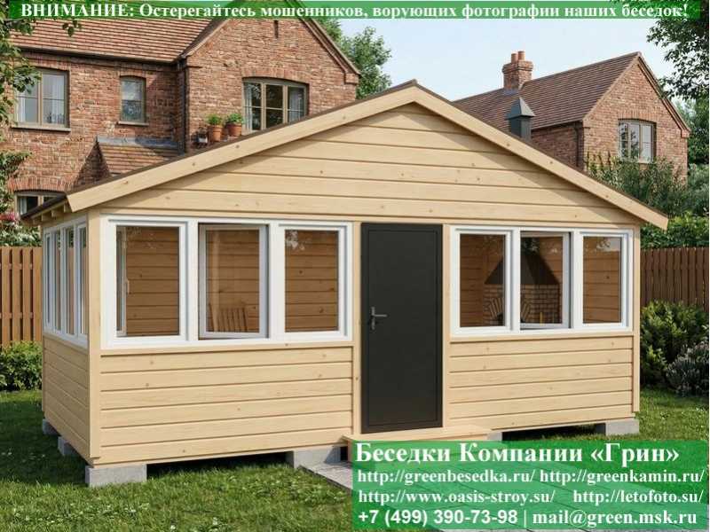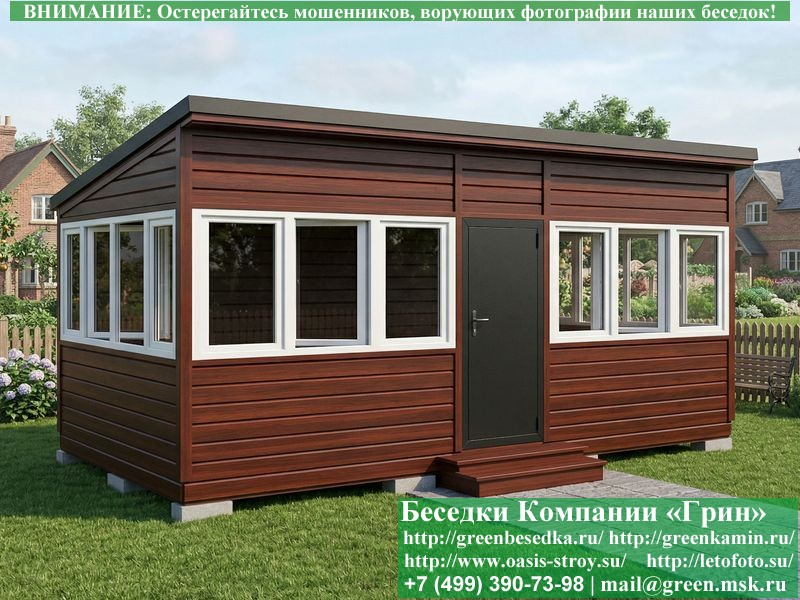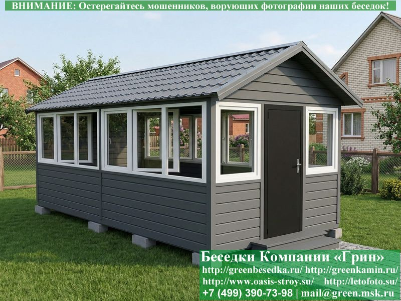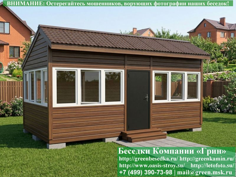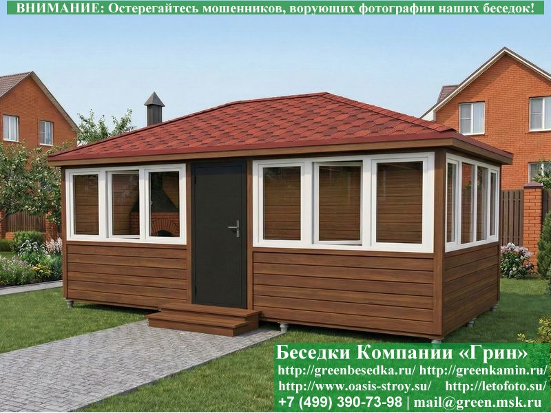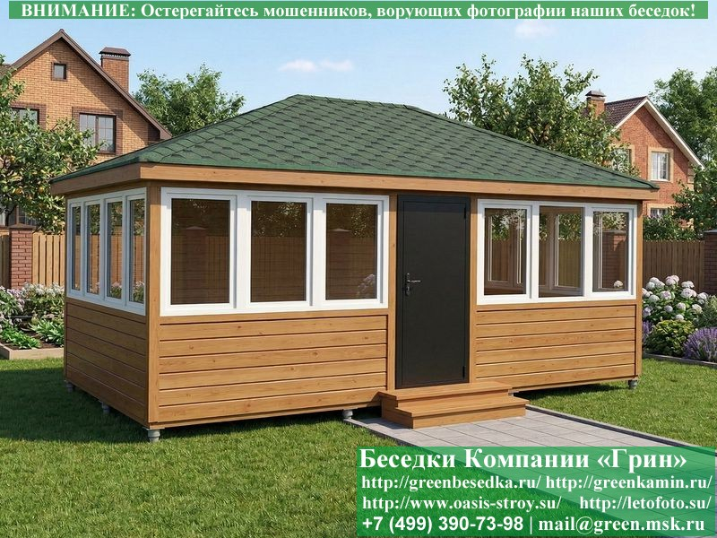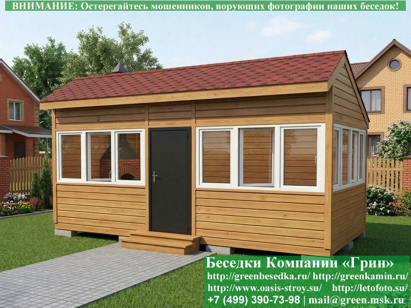Застекленная беседка 3х6 метров изготавливается из сосны, по специальной каркасной технологии. При строительстве беседок используется сухое дерево камерной сушки. В качестве каркаса беседки используется  очень надежная Имитация бруса 17х140 мм. В отличие от вагонки, она не гнется, не набухает и не идет трещинами. Имитацию бруса можно заменить на блокхаус (имитация бревна). Используется усиленная конструкция крепления стенок. В качестве несущих стоек используется строганый брус. По углам дополнительно устанавливается брус 90х90 мм. На пол кладется толстая сухая строганая доска 35 мм (не шпунт). Пол обрабатывается антисептиком. Половую доску можно заменить на шпунтованную 36 мм или террасную доску ДПК. В беседку устанавливаются однокамерные пластиковые окна фирмы "Века". Окна заказываются в Лемана-Про. Количество застекленных сторон и количество открывающихся окон обговаривается дополнительно. Устанавливается железная, алюминиевая или пластиковая дверь. Беседки изготавливаются с односкатной, двухскатной, четырехскатной крышей. На крышу кладется металлочерепица, мягкая черепица или профлист: Коричневых, Зеленых, Бордовых, Серых цветов. Срок изготовления и монтажа беседки на участке составляет 14-18 дней (срок изготовление пластиковых окон). Беседки поставляются в не крашеном виде. Возможна покраска беседок в цеху или полная обработка антисептиком. Дополнительно предлагаем установку в деревянные беседки с пластиковыми окнами недорогих безопасных быстровозводимых печей-барбекю, установка в течение дня, или более дорогих и сложных комплексов-барбекю и мангалов-барбекю из кирпича.